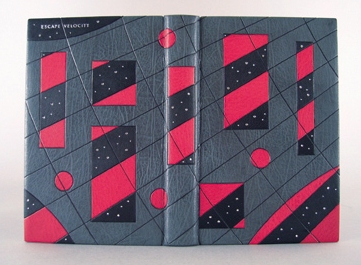 Gray goatskin leather over laced on boards. Red and black leather onlays, and blind and silver foil tooling create a grid in cyberspace. Edges colored black , red silk headbands and black Bugra endsheets. Text investigates the impact of computer technology on humankind's attempt to escape cultural and physical limitations.