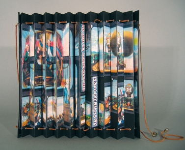 Romance of ballooning created from images of old lantern slides distributed on folds of an accordion book made of black Canson paper and Japanese cloth covers. When expanded, multiple views can be seen from different directions. Laced cords pull accordion closed, housed in a slender box. BEEJ NIERENGARTEN-SMITH is Museum Manager of the new Anderson-Abruzzo Albuquerque International Balloon Museum. Since 1974, images from her career in the arts, museums and education have always found their way into her books. Old and new ballooning pictures from the museum's collection gave rise to the creation of a recent series of artists' books on flight. |