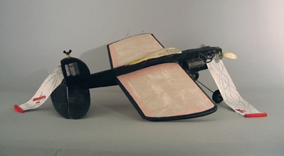 Altered 1960's gas powered, U-Control model airplane containing two hand lettered and illustrated scrolls outlining the history and dangers of flight. Scrolls resemble sky-borne advertisement banners when pulled from the airplane tail and the propeller. Colophon hidden in the spark plug compartment. Wings recovered in handmade paper. PETER & DONNA THOMAS are book artists, active in leadership of the Miniature Book Society. Their miniature books, fine press books and the use of alternative structures in the artist book are internationally recognized. They have been self-employed in the book arts since 1977, making books, teaching workshops and giving lectures. |