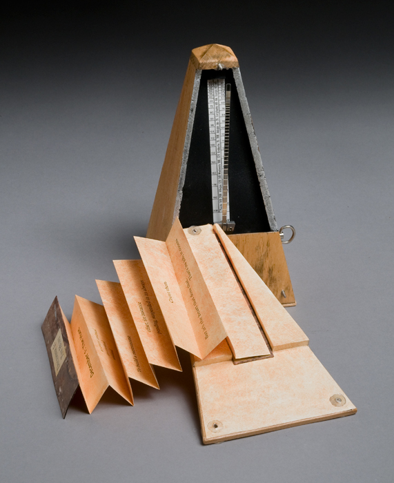 December 1: The Hunt is a twelve-panel accordion housed in a functional wind-up metronome case fitted with a custom lid of wood and leather. The text block