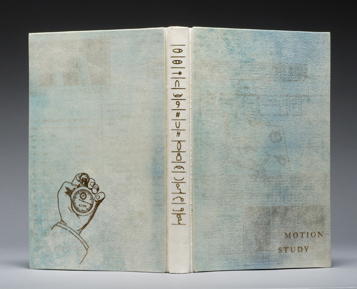 Motion Study: full vellum binding (three-piece structure), title stamped in gold on front board. Illustrations on rear board and spine stamped in gold;