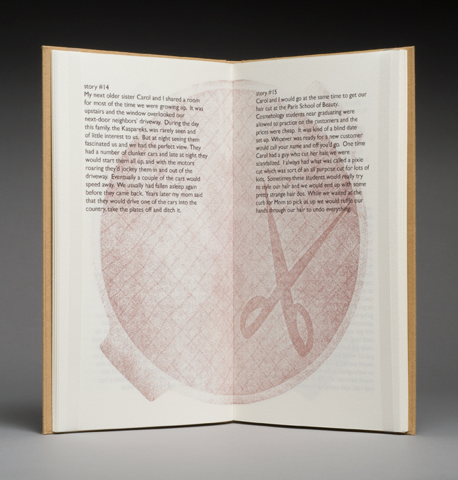 A relief-printed book using pressure printing, letterpress, and ink-jet. The text is a set of fifty short, sometimes very short, stories of events from my
