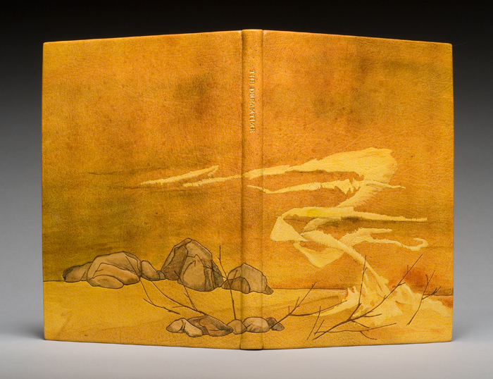 sunset sky. Dyed, pared, and feathered onlays were used with blind tooling. The title is tooled in gold leaf. 9.5 x 7 x 0.5 inches, 24 x 18 x 1.5 centimeters.