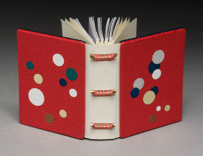 each copy has a unique binding. This copy is sewn in a long stitch through a kid vellum spine, incorporating bent brass rods as stiffeners. It features a