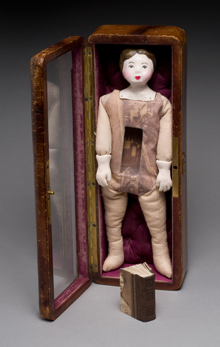 A Coptic-sewn book with a full-case binding of brown calfskin is nestled in the belly of a doll. The doll’s body is hand crafted of muslin with an